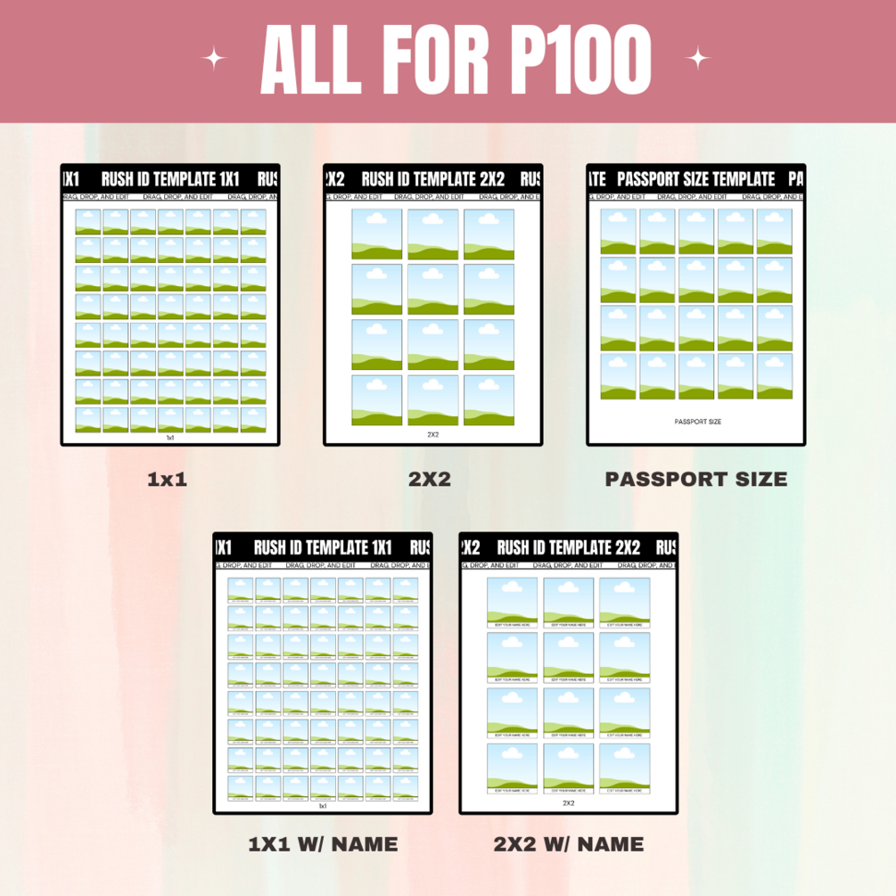 You'll get an editable canva template of 1x1, 2x2, 1x1 w/ name, 2x2 w/ name, and passport id sizes. Just drag your photos and drop into our frames, and you're ready to print and go!